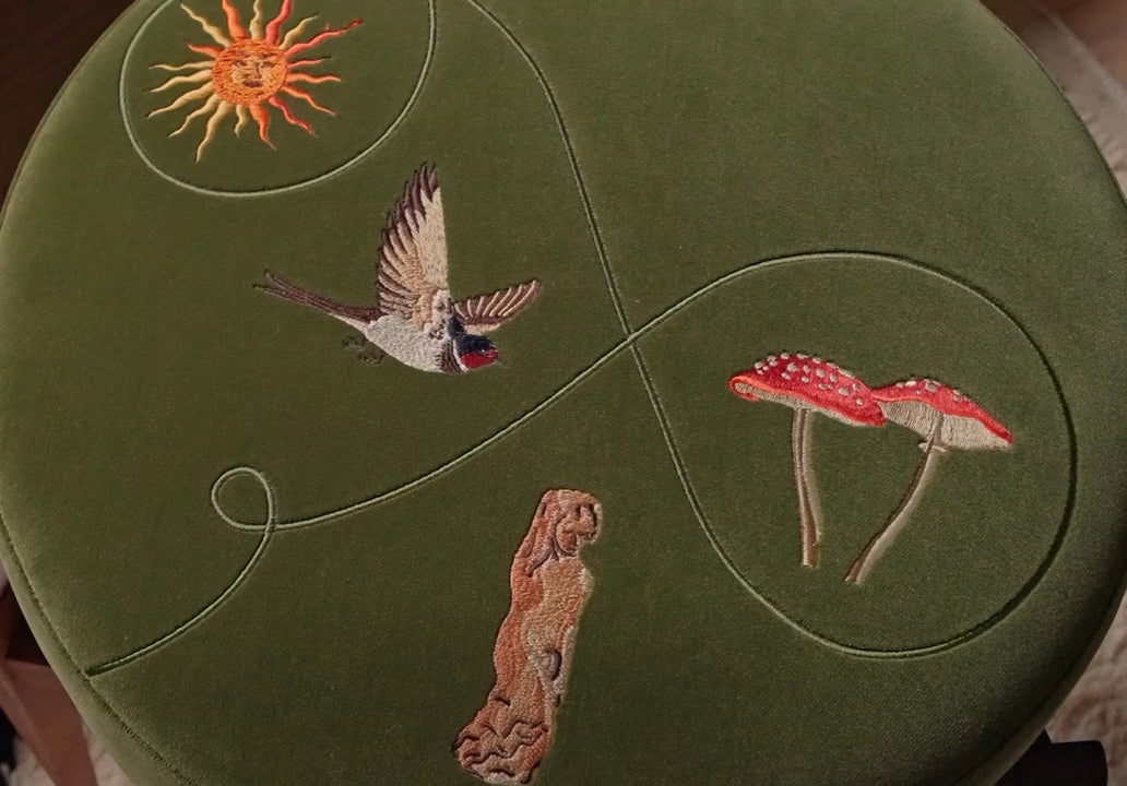 Founded by Kara Douwma, Uncommon Ancestor creates finely crafted footstools with bespoke embroidery. Each design begins with a story and set of hand-drawn motifs; the design is then translated into embroidery by London artisans using a thoughtful combination of stitches and threads on a rich velvet base. The embroidery sits on top of a solid walnut frame that’s handmade in a small workshop in East London. The final piece invites the owner to dive deeper into the meaning behind the embroidered motifs so they become a part of their own story.