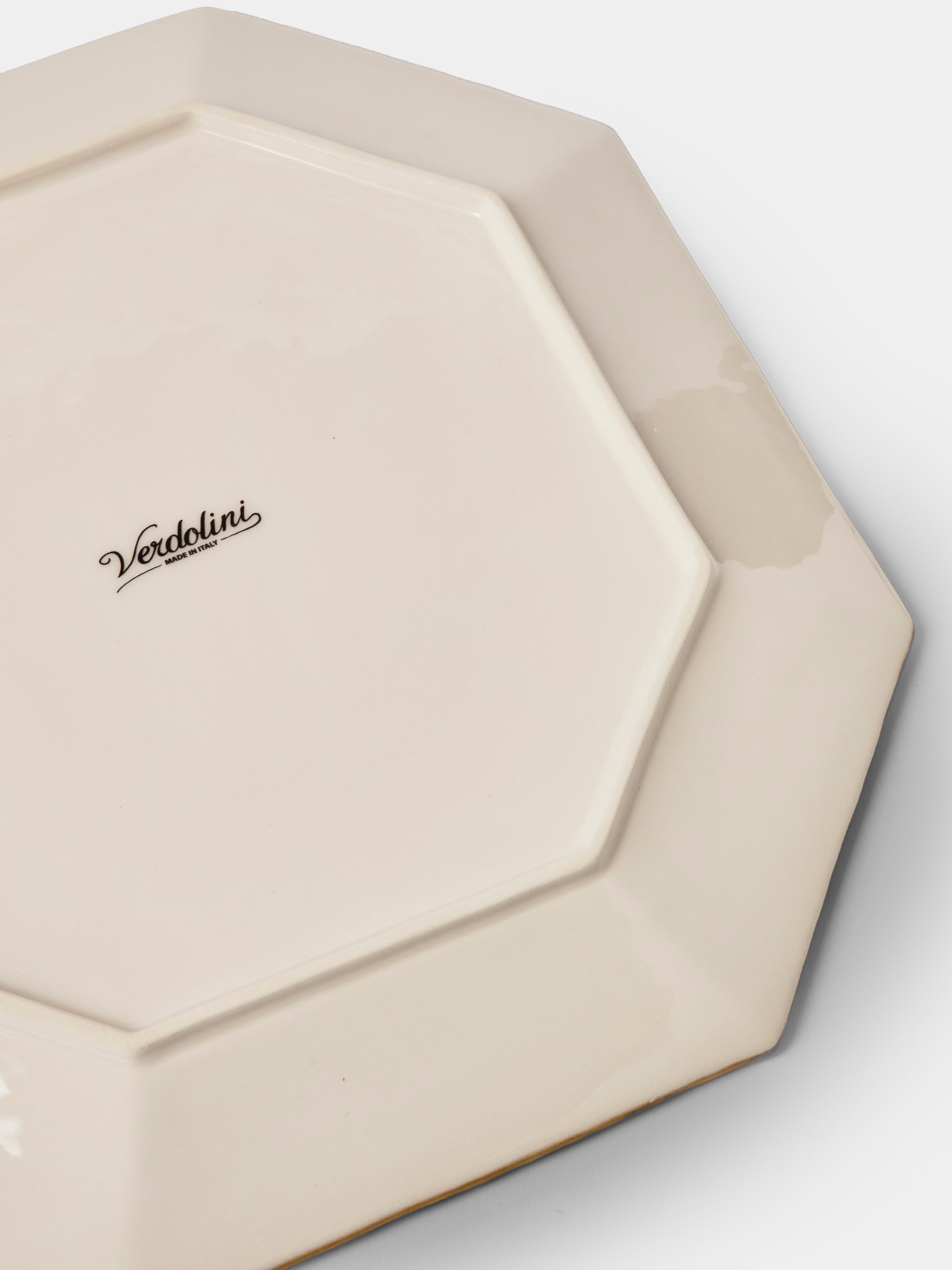 Born in northern Italy in 1964, Verdolini tells its story through ceramics, where earth, glaze and imagination meet. Each piece is shaped and finished by hand, its character revealed through centuries-old techniques and a quiet sense of wonder. Majolica brings to life scenes of foliage and frogs, while Traforato engraving lends lace-like intricacy to borders and edges. A Verdolini specialty lies in reviving archival designs, where historic patterns are reinterpreted with a playful eye and deep respect for the past.