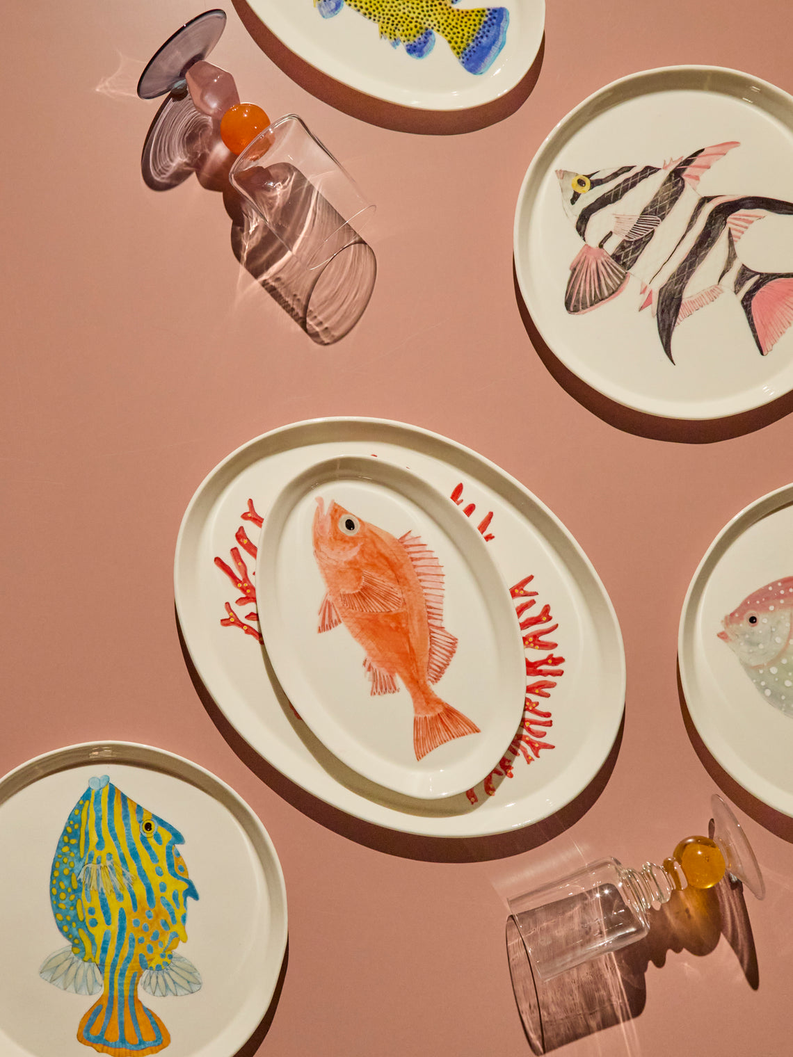 Casa Adams’ beautiful artwork, sketched by founder Araceli, is inspired by the hand-coloured natural history copperplate engravings of the 18th century. Her whimsical illustrations are monoprinted onto Australian porcelain, which is fired, painted and finished by hand using watercolour-like washes of underglaze – a meticulous technique mastered and executed in-house by Araceli and her husband, Dominic. Her approach is environmentally conscious and considered at every turn, from the biodiverse line-up of sea creatures she spotlights to the regenerative energy used to power her all-electric workspace in Sydney. Her reverence for nature runs so deep that she plants a native tree or shrub for each piece sold.