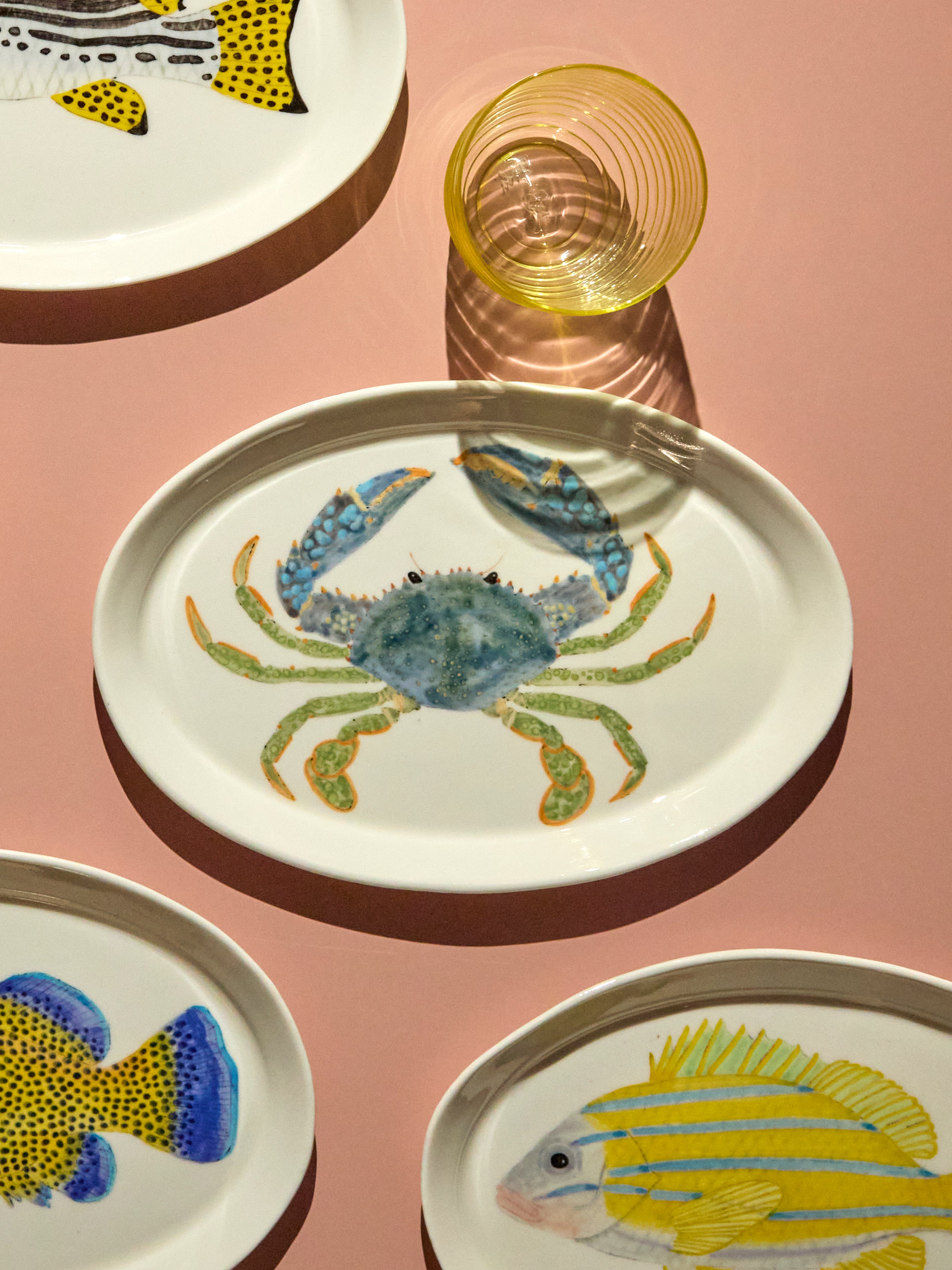 Casa Adams’ beautiful artwork, sketched by founder Araceli, is inspired by the hand-coloured natural history copperplate engravings of the 18th century. Her whimsical illustrations are monoprinted onto Australian porcelain, which is fired, painted and finished by hand using watercolour-like washes of underglaze – a meticulous technique mastered and executed in-house by Araceli and her husband, Dominic. Her approach is environmentally conscious and considered at every turn, from the biodiverse line-up of sea creatures she spotlights to the regenerative energy used to power her all-electric workspace in Sydney. Her reverence for nature runs so deep that she plants a native tree or shrub for each piece sold.