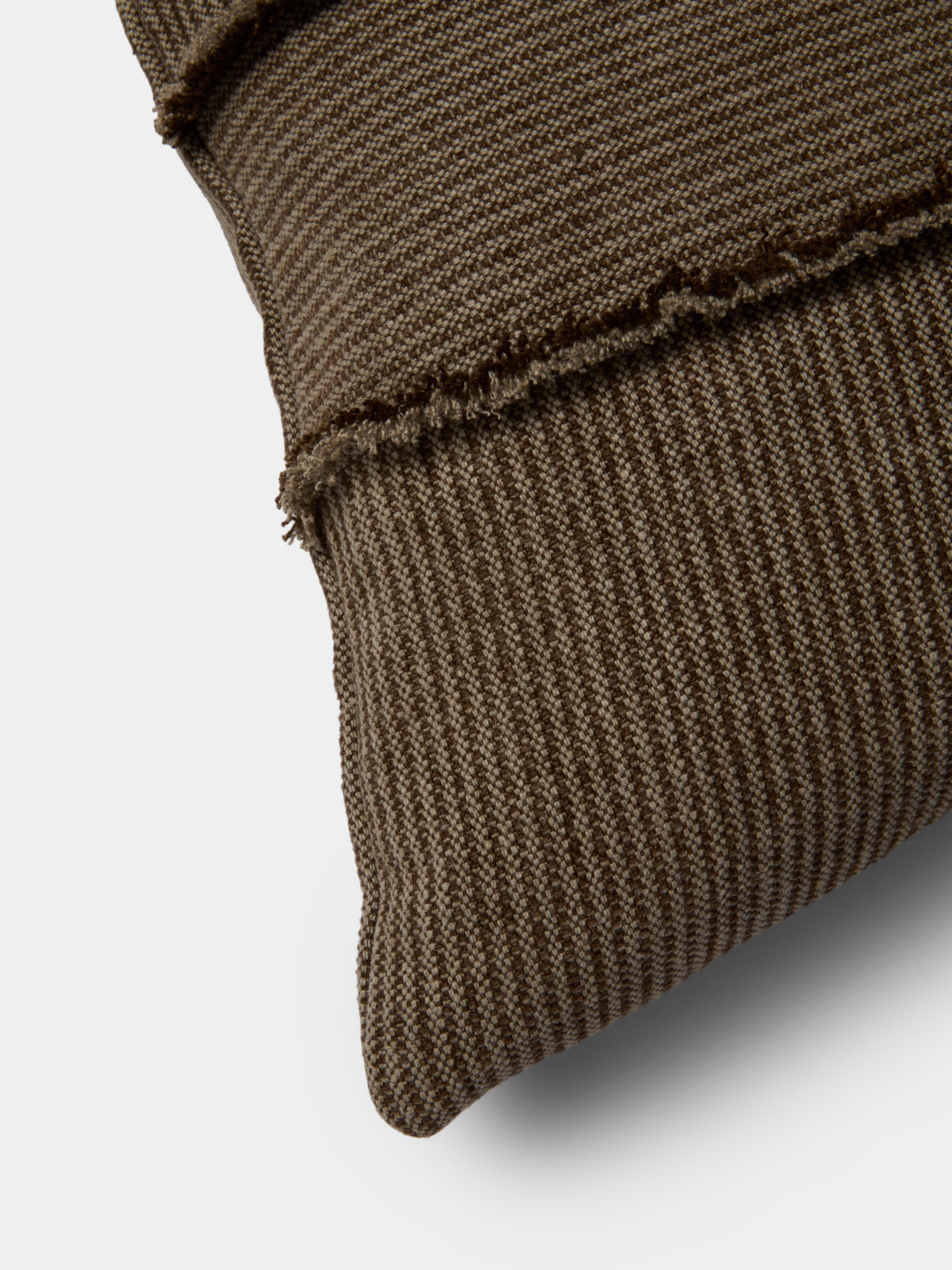 The Salopette cushion by de La Cuona brings a refined edge through its workwear-inspired pinstripe linen. Handmade and stonewashed, it features a paneled design that plays with fabric orientation to create subtle depth and dimension. A fine frayed fringe reveals the natural warp and weft.
