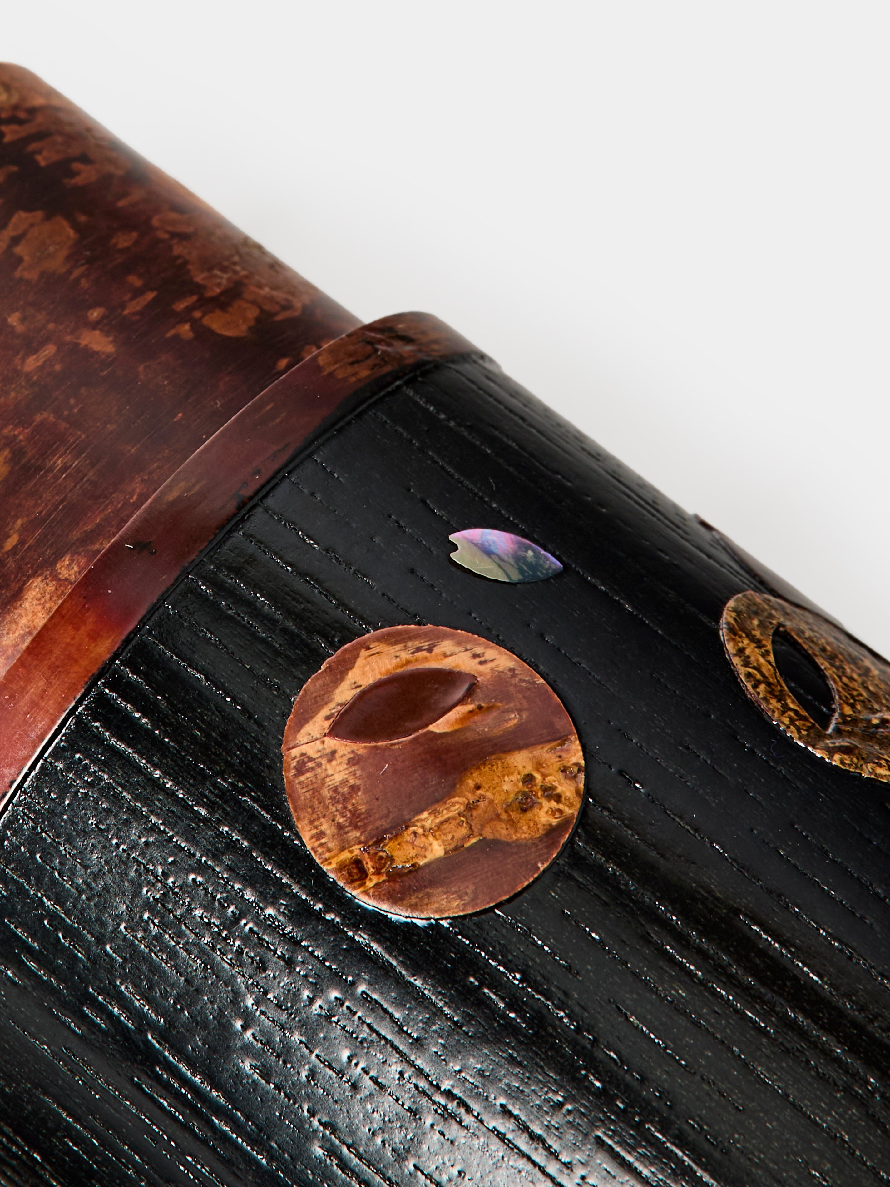 Teaware is at the heart of Denshiro’s craft—but not just any teaware. This tea canister is made from wild cherry bark sourced from Kakunodate, the brand’s historic hometown. The original design features the traditional tsubo-tsubo crest of Urasenke, one of the main schools of Japanese tea ceremony, which sits proudly alongside raden mother-of-pearl petals.