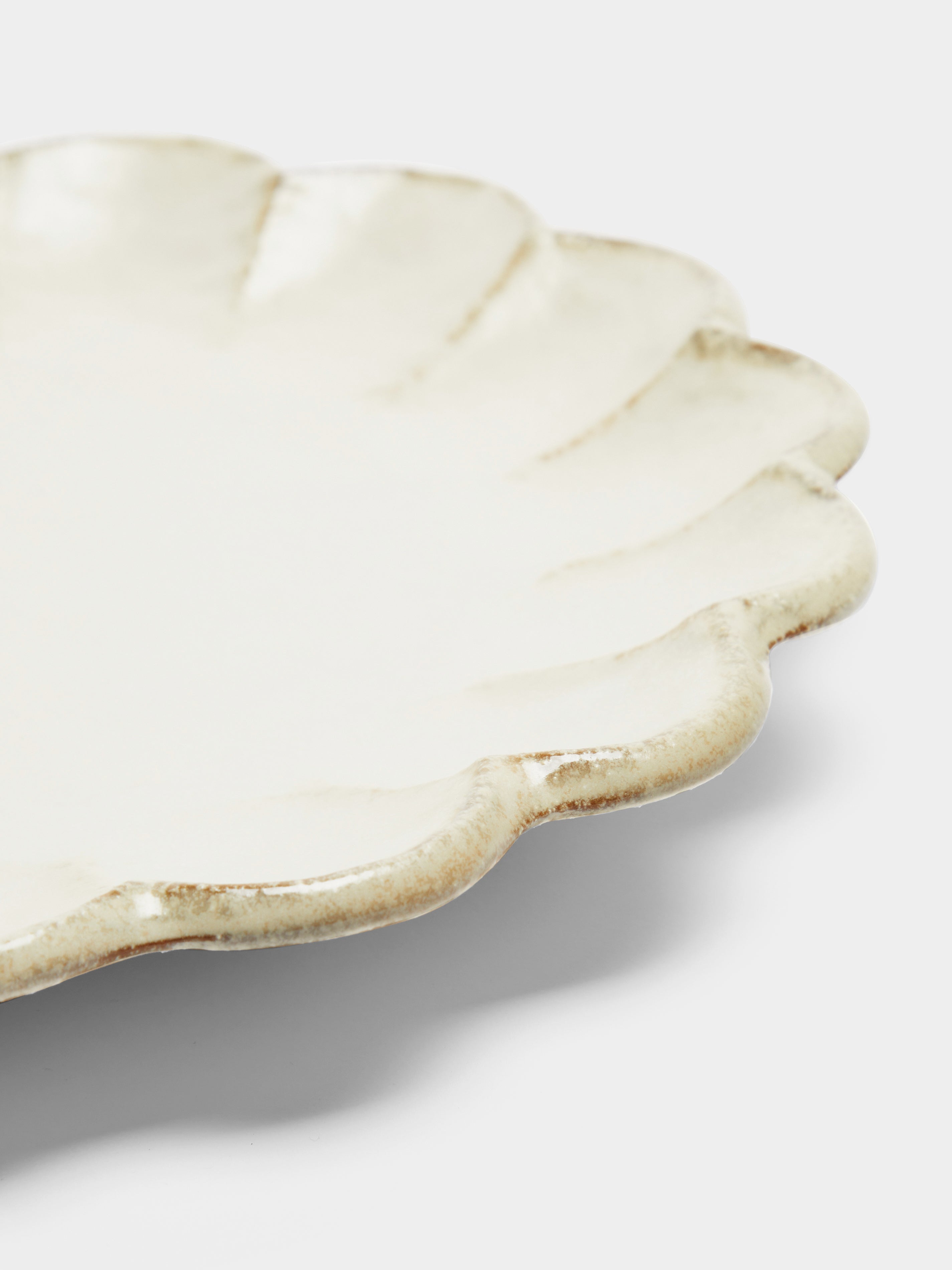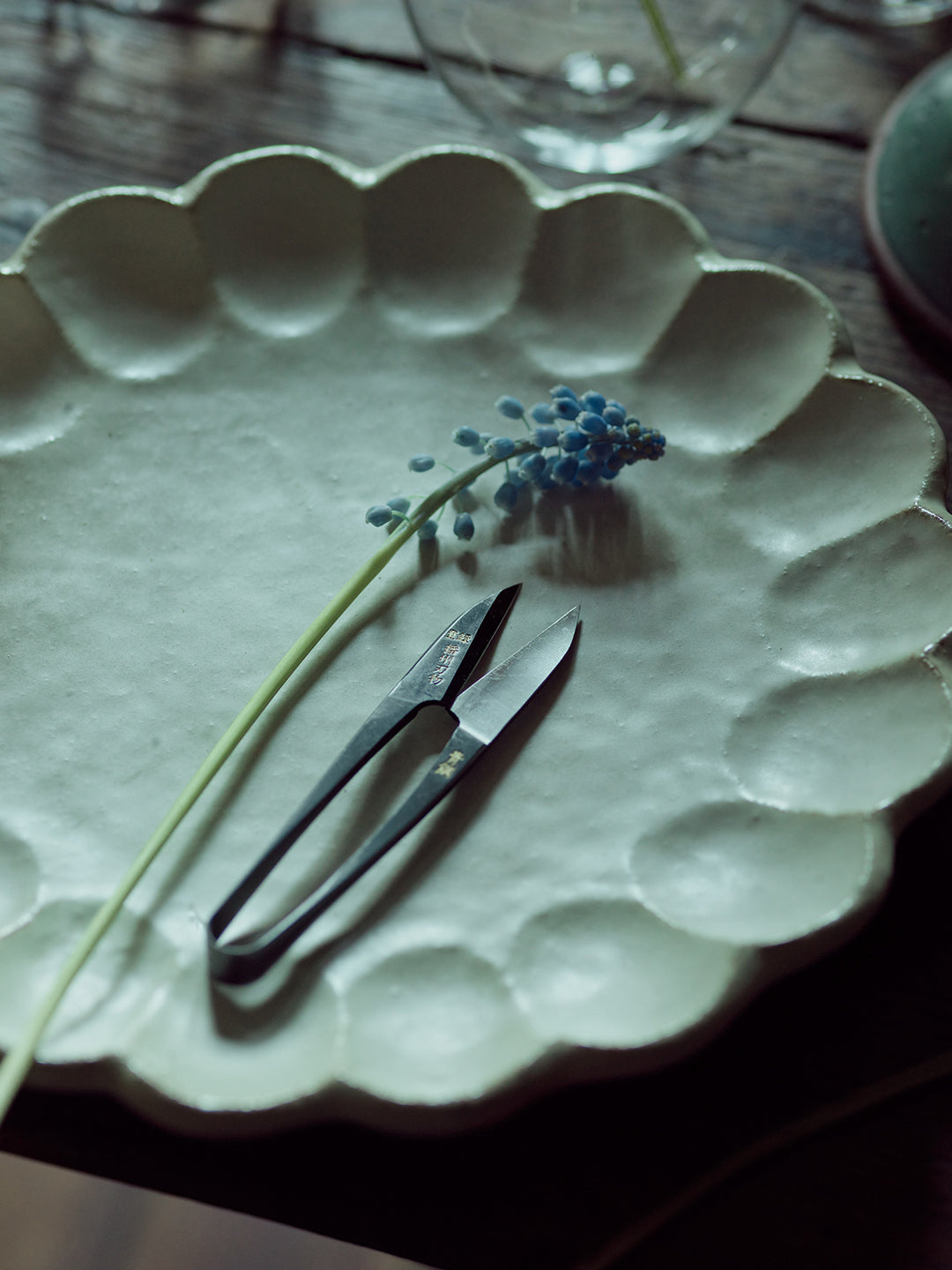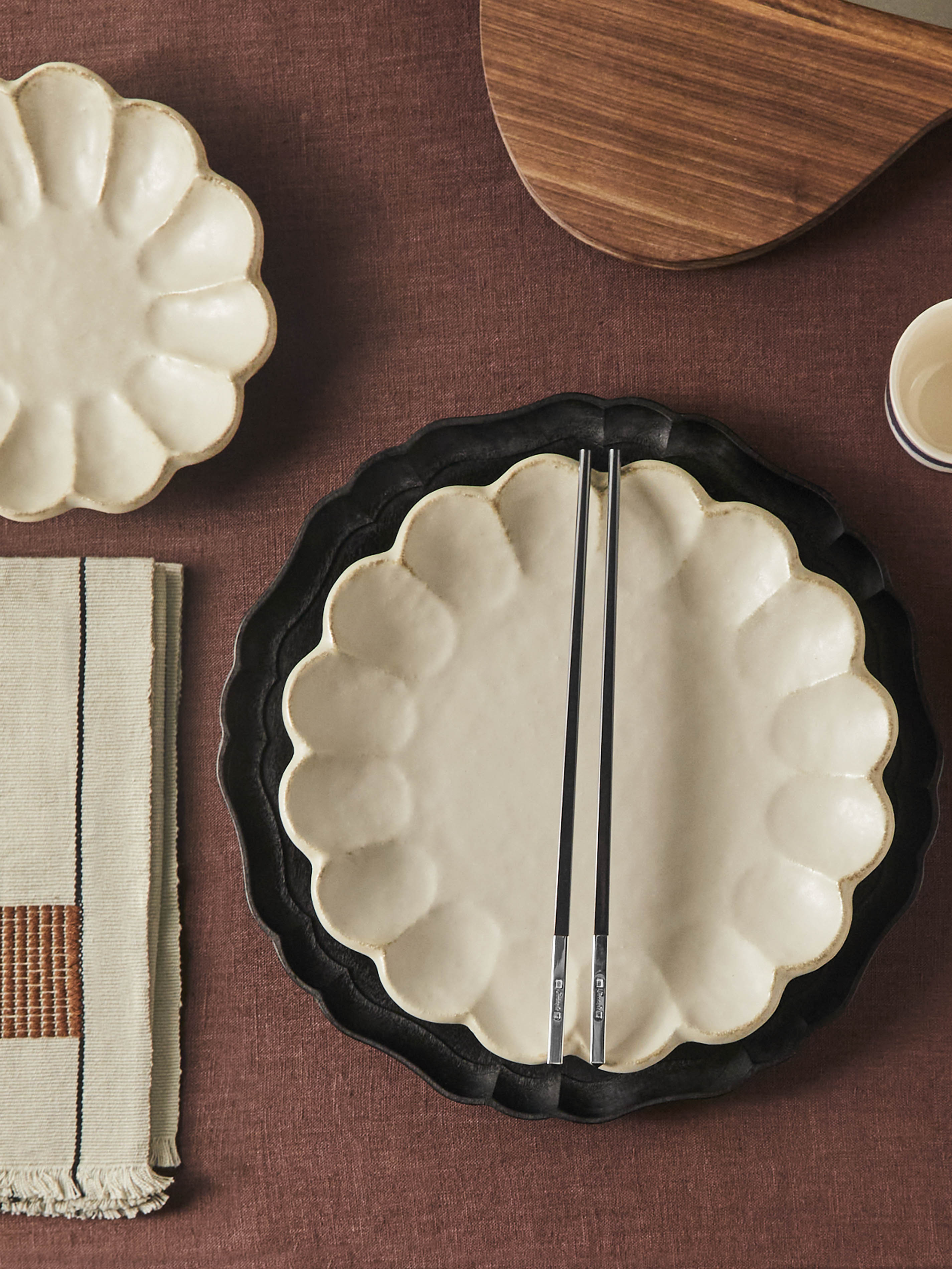 Kaneko Kohyo’s story spans a century (and counting), beginning with its first firings at a mountaintop kiln in Toki, Japan. Three decades ago, the workshop expanded into tableware, developing a recognizable signature: charming scalloped edges and a rustic, natural palette of off-white, black and blue. From sake cups to dinner plates, every piece is shaped by hand for an organic warmth and quiet individuality—qualities no machine can truly replicate.