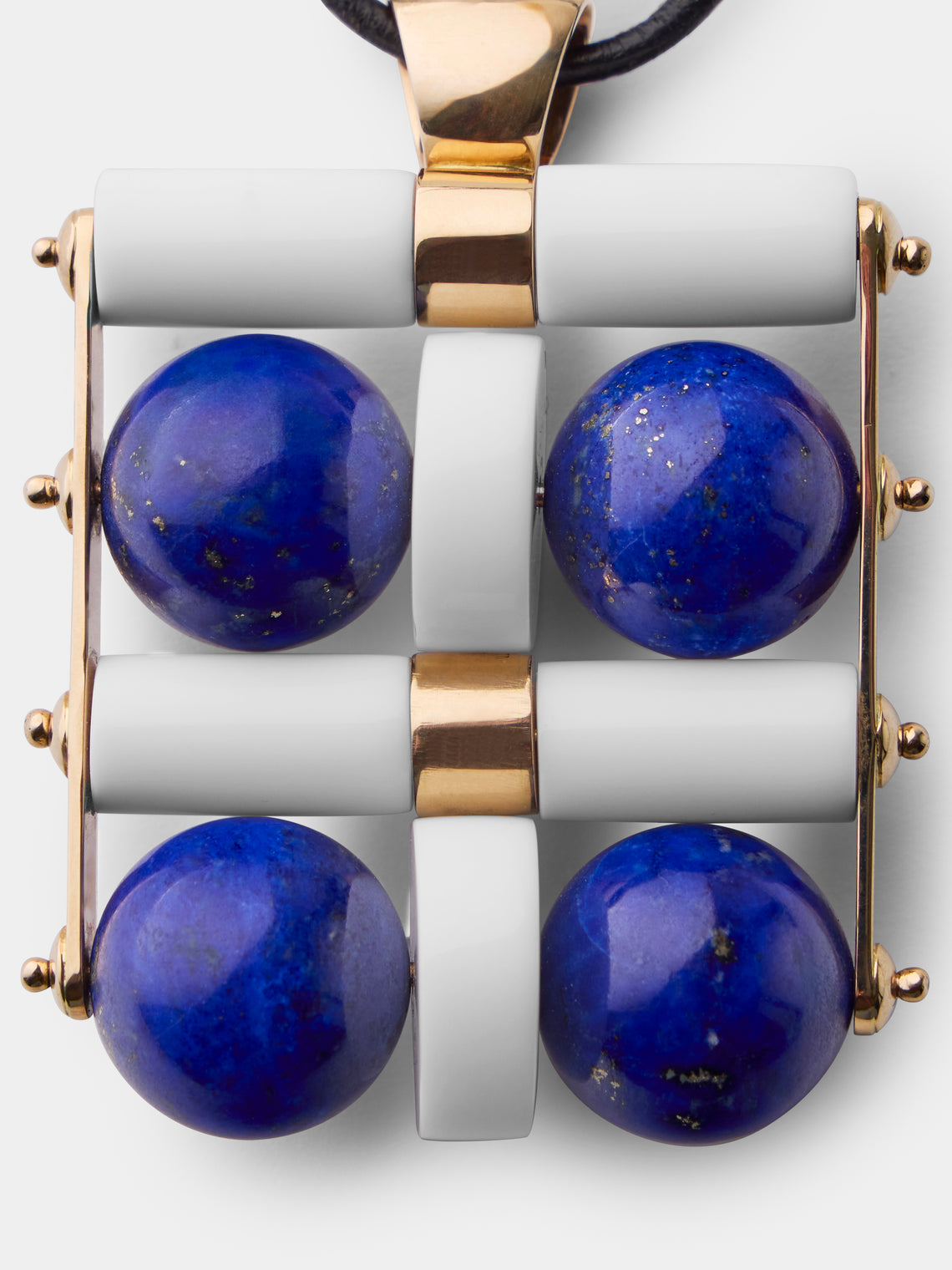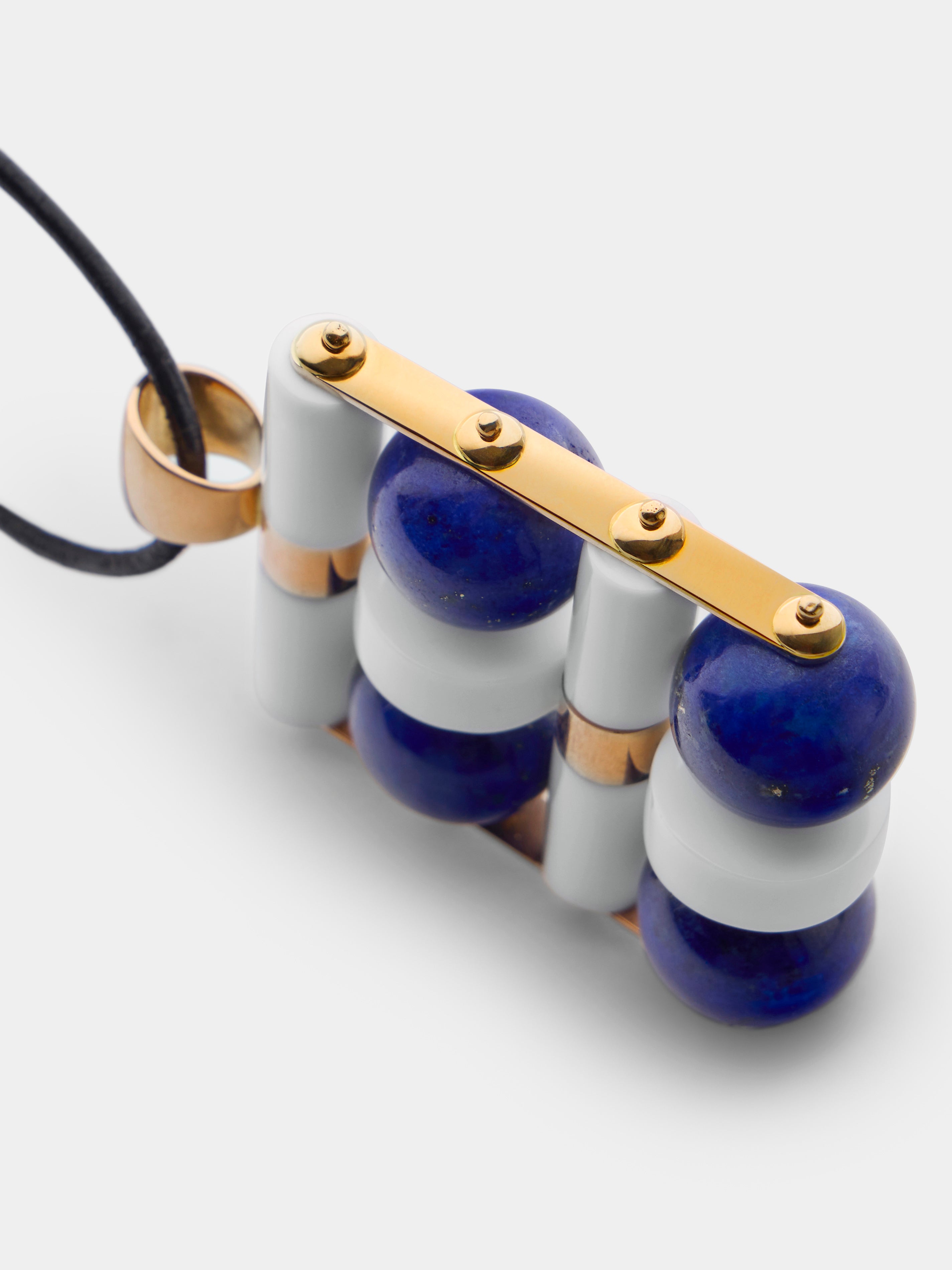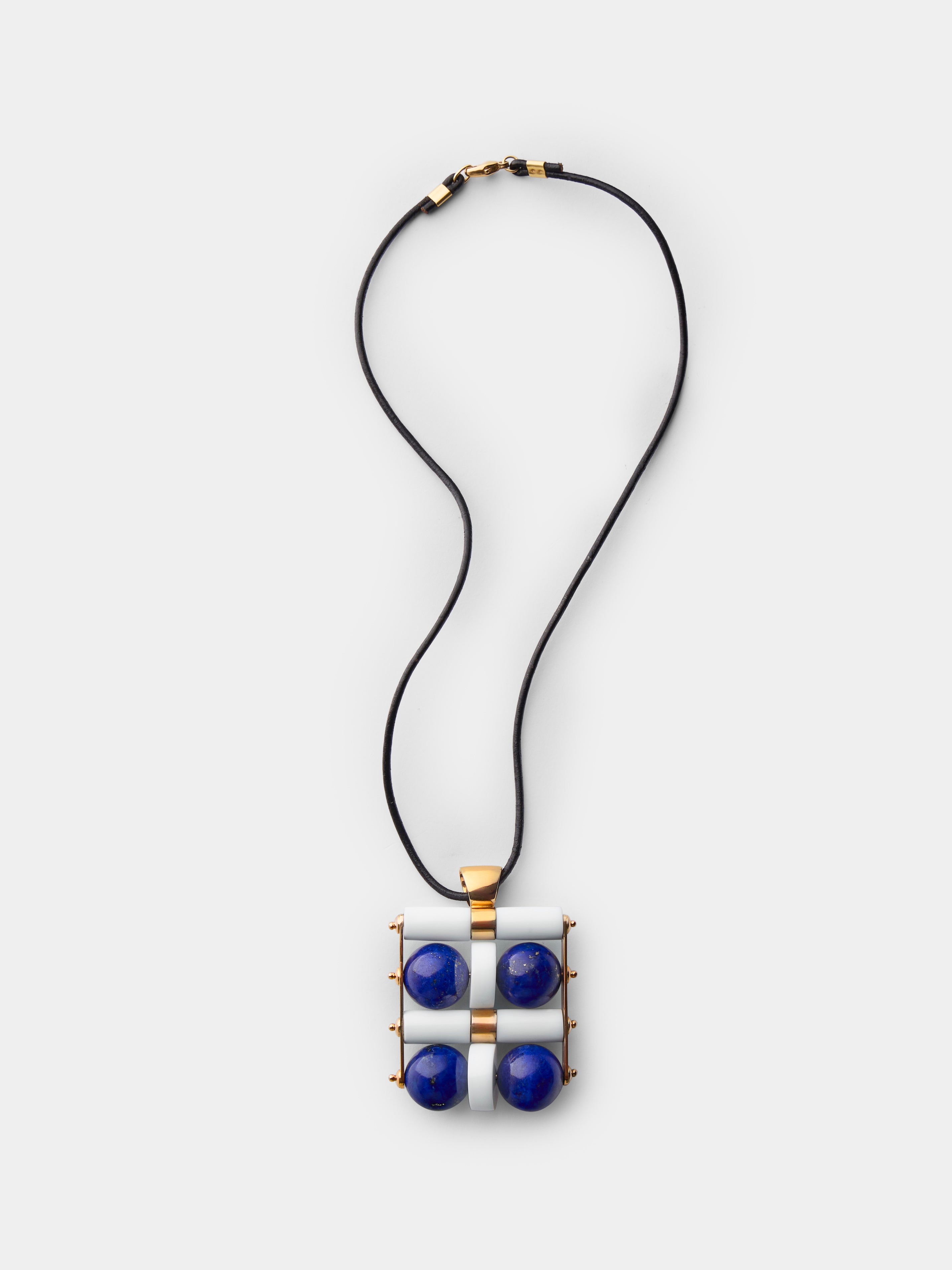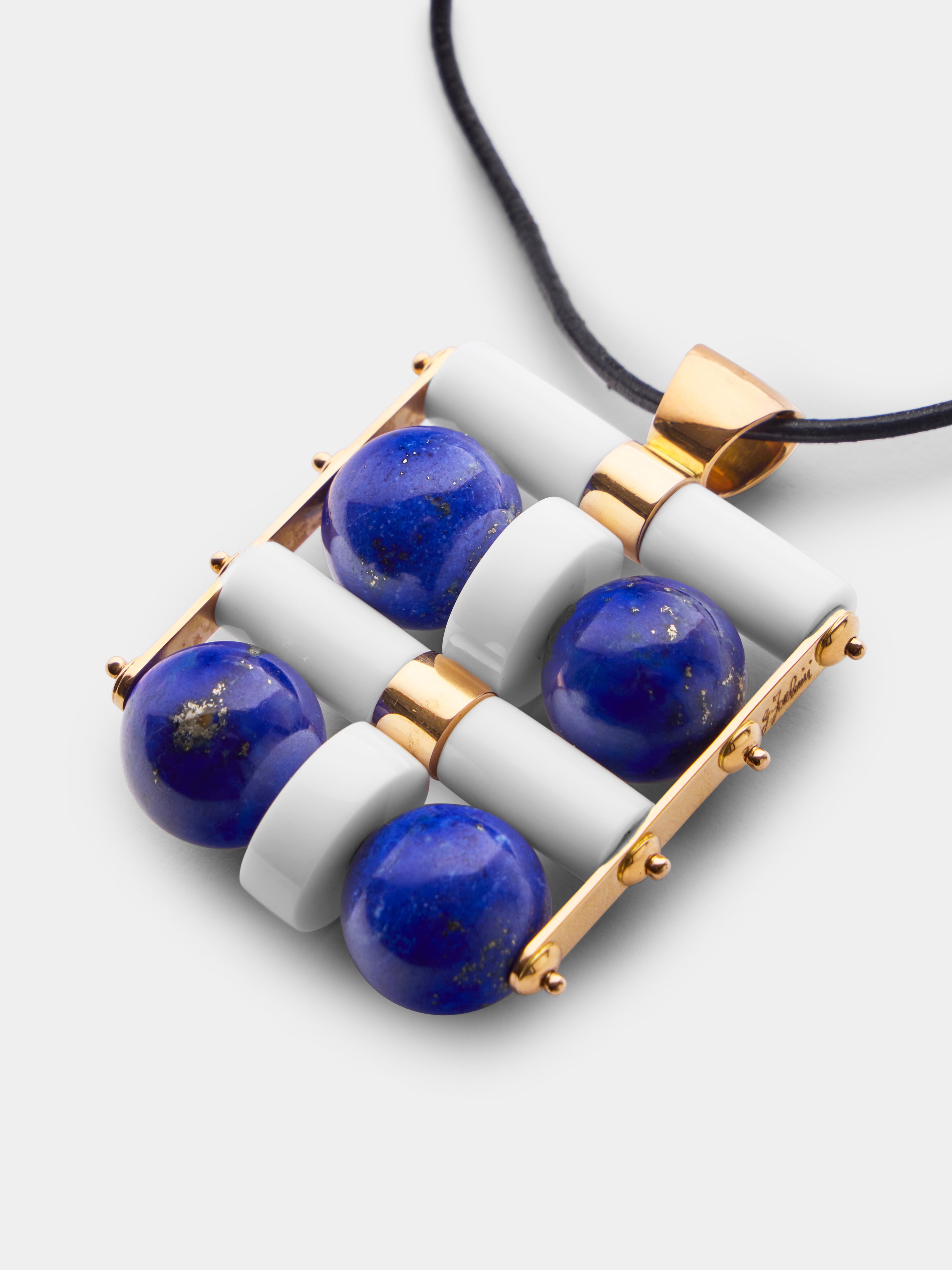 Italian-born Giorgio Facchini found his calling young, apprenticing as a goldsmith from age ten. As his artistic inclinations grew, he studied with sculptor Edgardo Mannucci and began to create both abstract sculpture and unique modernist, artist jewelry which incorporated classic goldsmithing with space age designs. His architectural pieces explored space and light, while his 1969 collection revealed his enduring interest in kinetic, spatial and futuristic elements, catching the eye of Pierre Cardin. This 18-karat yellow gold pendant delivers an eye-catching profile courtesy of its dynamic design and combination of 18-karat yellow gold, lapis lazuli and white agate.