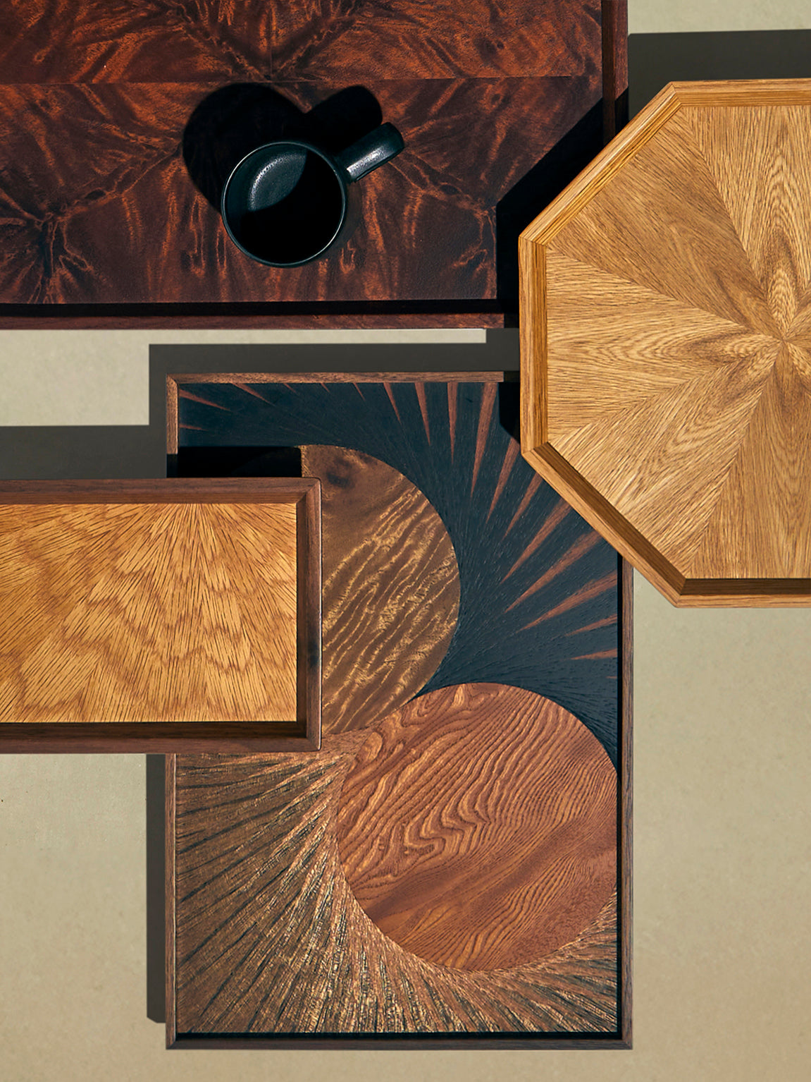 Since 1953, Tokushima-based Mori Kougei has been specialising in tsuki-ita, a highly complex technique in which paper-thin sheets of wood are sliced with sharp blades before being bonded together to form intricate surface patterns. This meticulous process has been refined and passed through the generations for more than 70 years. The result is a selection of functional trays highlighting the grain, colour and character of different wood species. Expect meticulously indigo-dyed pieces – a treasured Tokushima art – and subtle, contemporary scenes inspired by art, geometry and nature.