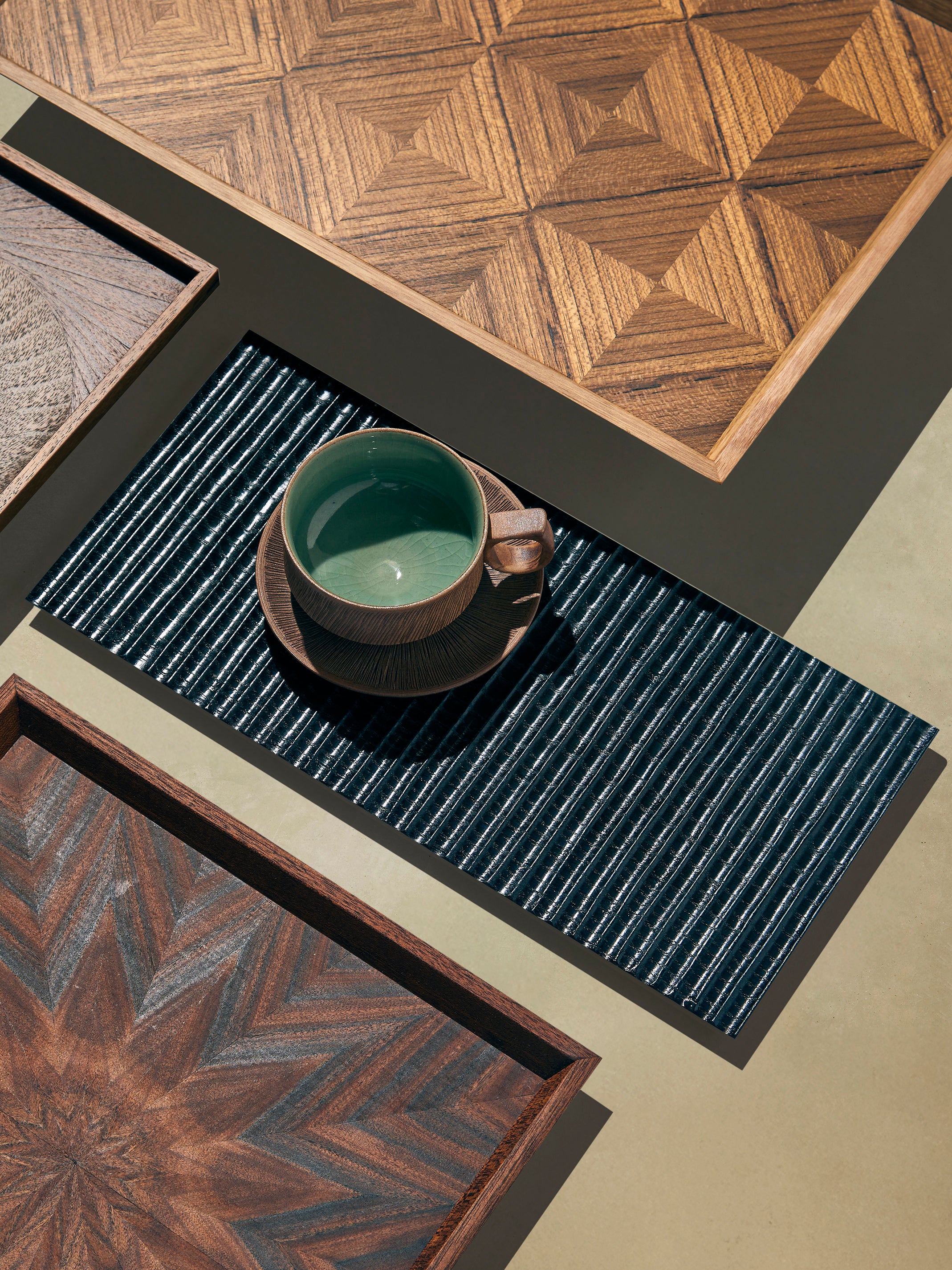 Since 1953, Tokushima-based Mori Kougei has been specialising in tsuki-ita, a highly complex technique in which paper-thin sheets of wood are sliced with sharp blades before being bonded together to form intricate surface patterns. This meticulous process has been refined and passed through the generations for more than 70 years. The result is a selection of functional trays highlighting the grain, colour and character of different wood species. Expect meticulously indigo-dyed pieces – a treasured Tokushima art – and subtle, contemporary scenes inspired by art, geometry and nature.