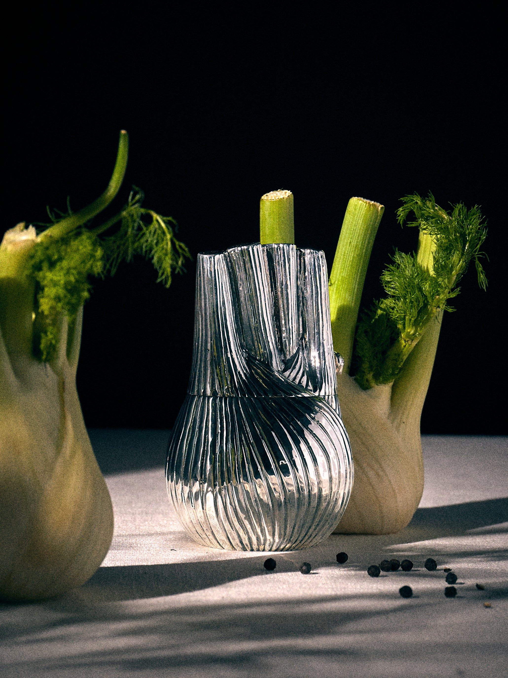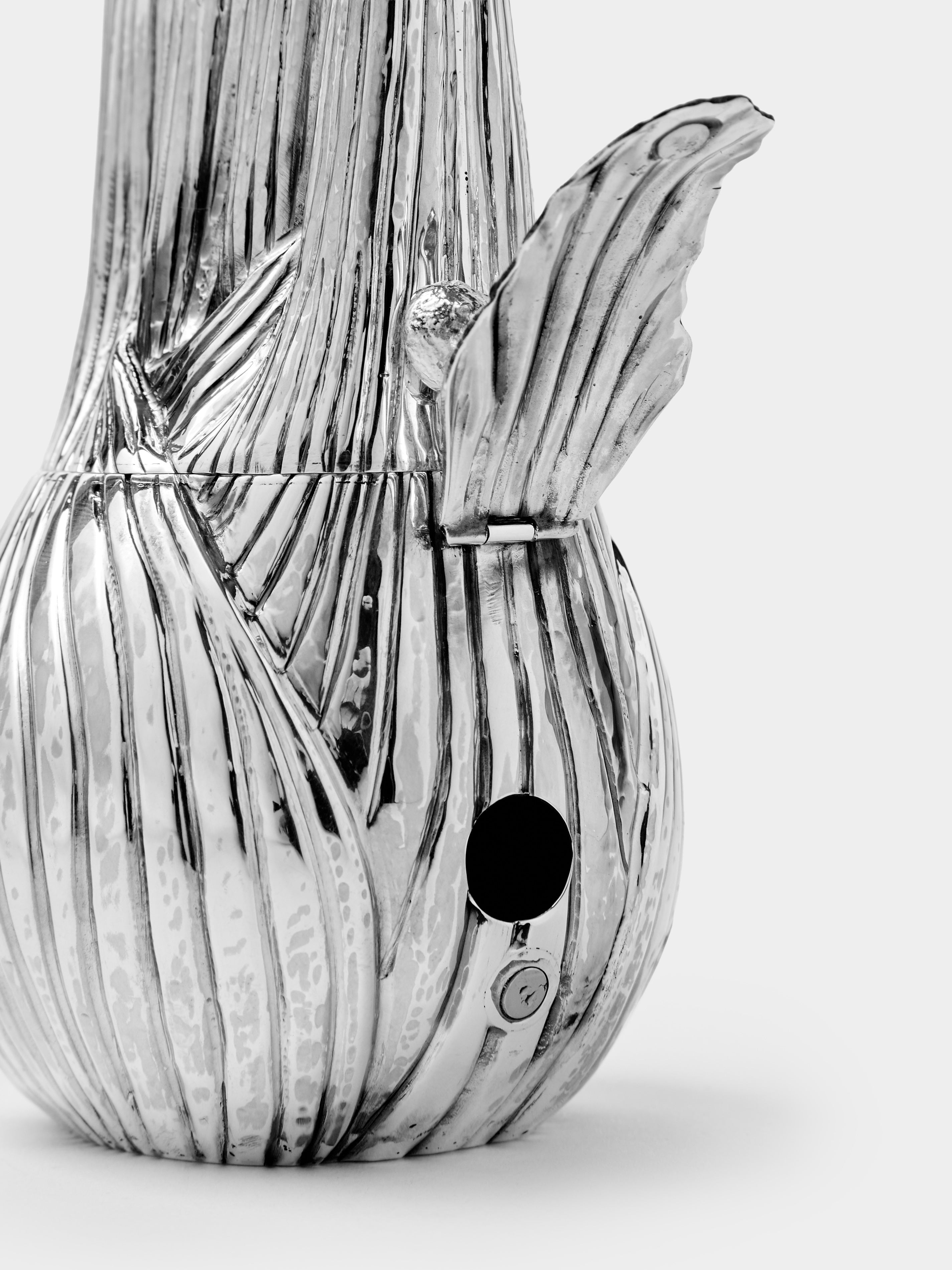 Since 1950, a small workshop in Milan, Orto Argenteo, has passed its silversmithing skills from one generation to the next, keeping alive the slow, careful rhythm of hand-worked sterling silver. Decades of collaborating with luxury houses inform thetextures and finishes, but the spirit here is delightfully light-hearted. Fruits and vegetables—from pomegranates to mushrooms, pumpkins totomatoes—are sculpted into silver salt and pepper shakers and grinders, turning the table into a place for craftsmanship (and a little mischief).
