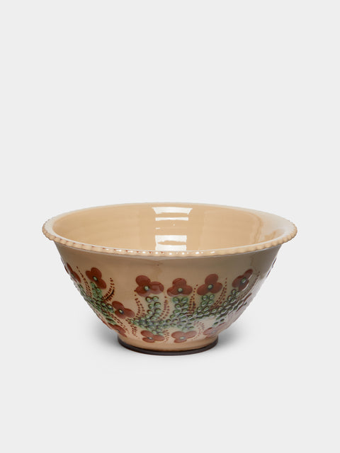Jean-Christophe Hermann grew up near Lake Annecy in France, and recalls visiting an old pottery at just five years old that inspired him to pursue ceramics – a moment that led to the opening of Poterie d’Évires in 1971. Influenced by the landscape of their Haute-Savoie home, the Hermann family – Jean-Christophe and David, the father and son duo – hand-paint local delights onto their light, earthy and decorative clay; alpine flowers like tiny crocuses and soldanellas often feature, as well as native creatures such as Chamois and Ibex. ABASK made a special road-trip to the French Alps to hand-pick a curation from their exquisite collection. In 1981, after exploring his region’s brocante for many years, Jean-Christophe opened a museum dedicated to the pottery and folk art of Savoie. It’s the largest and most comprehensive collection in the world and displays pieces that date as far back as the 12th century.