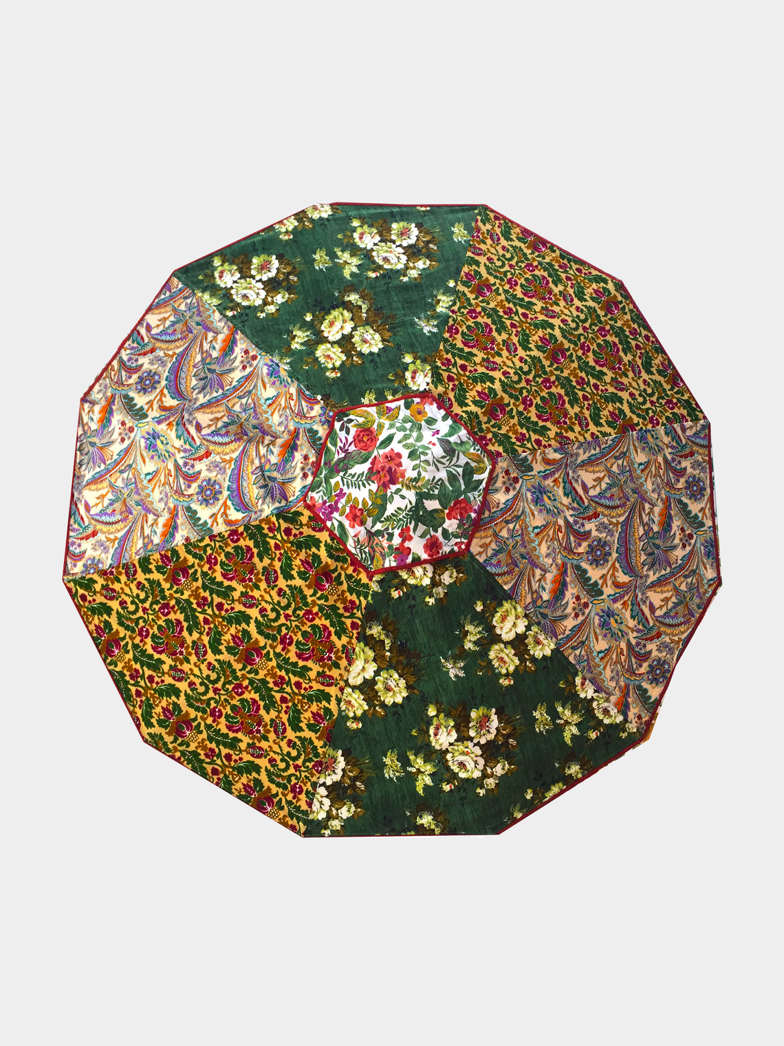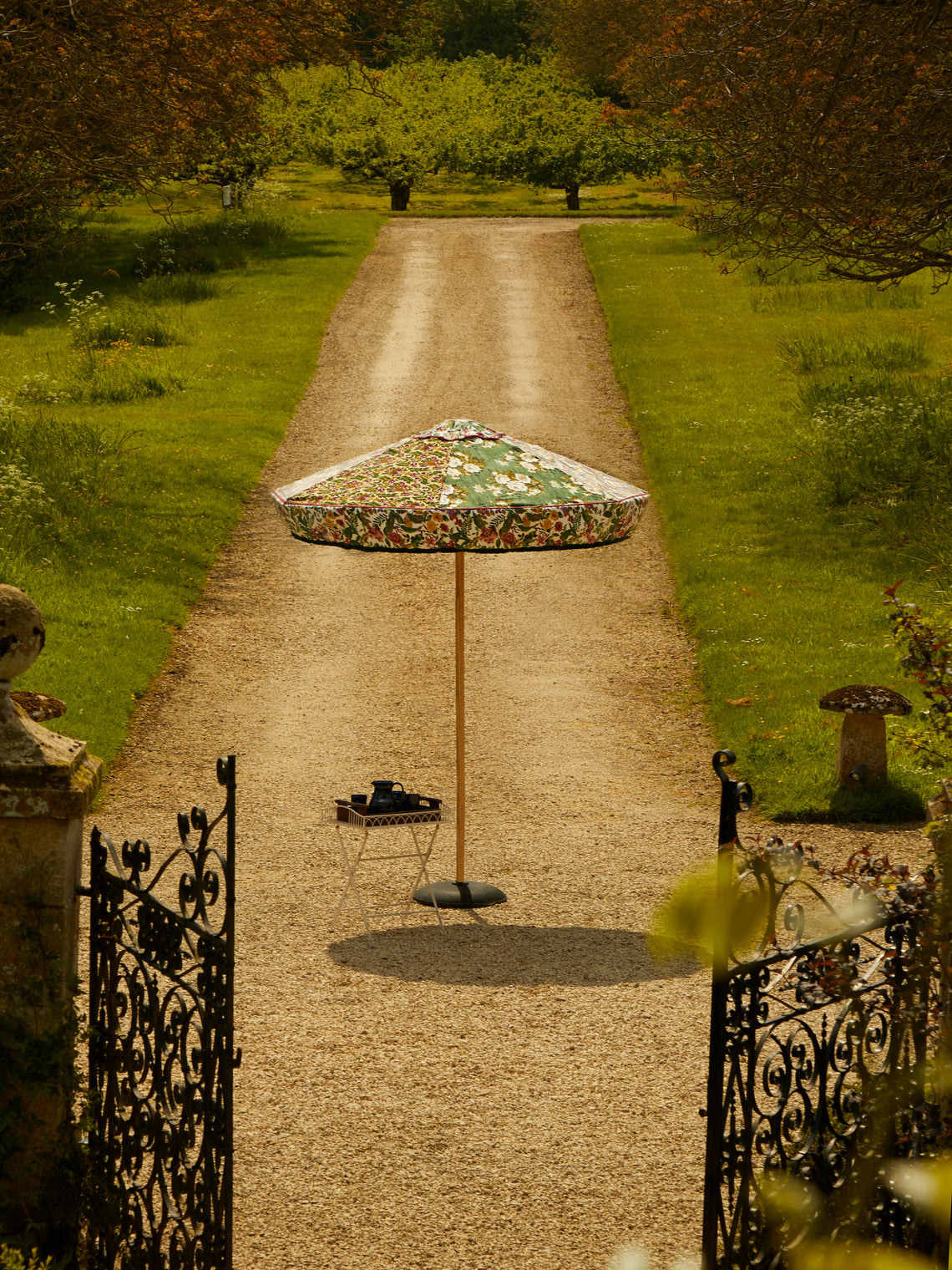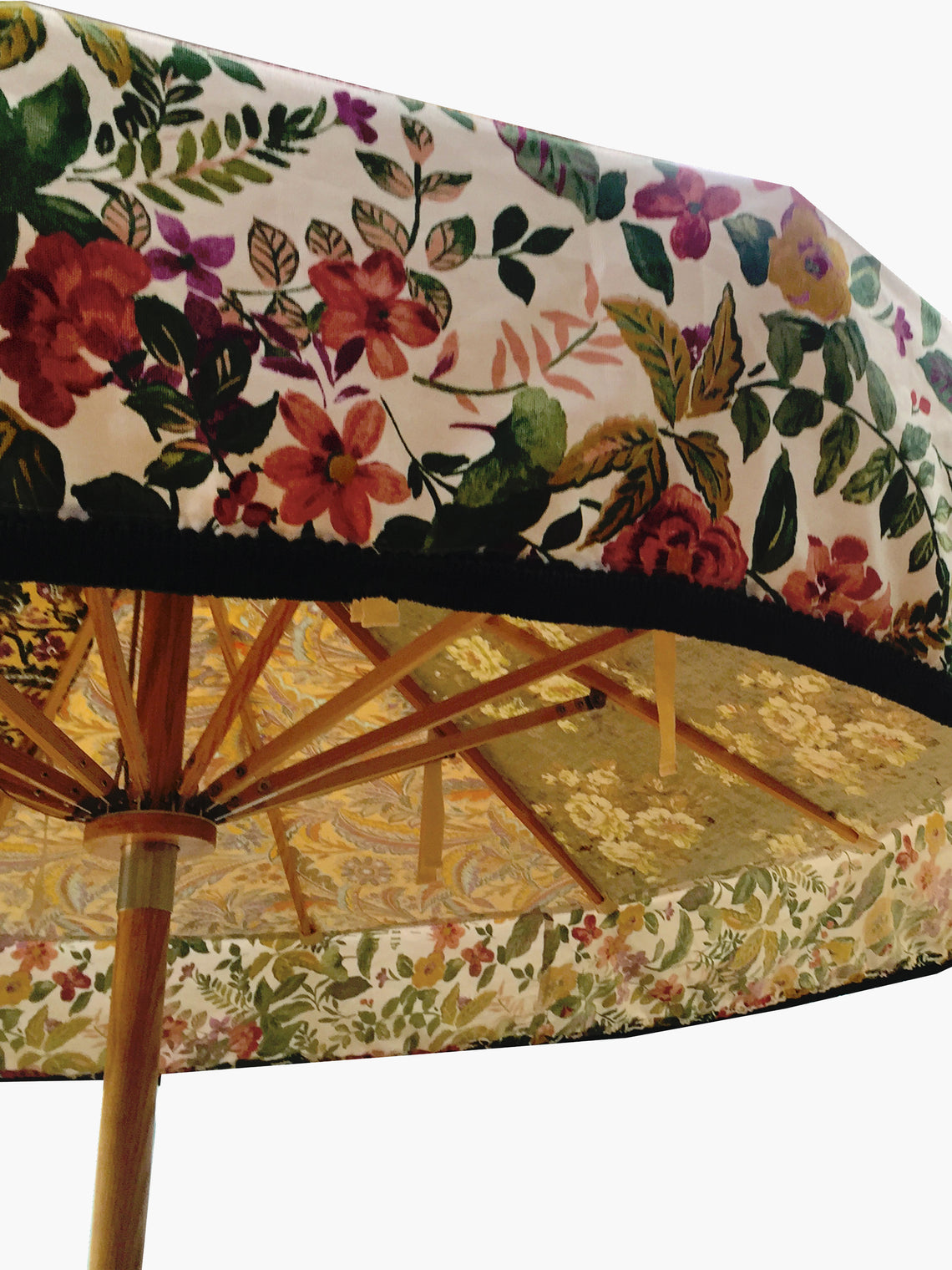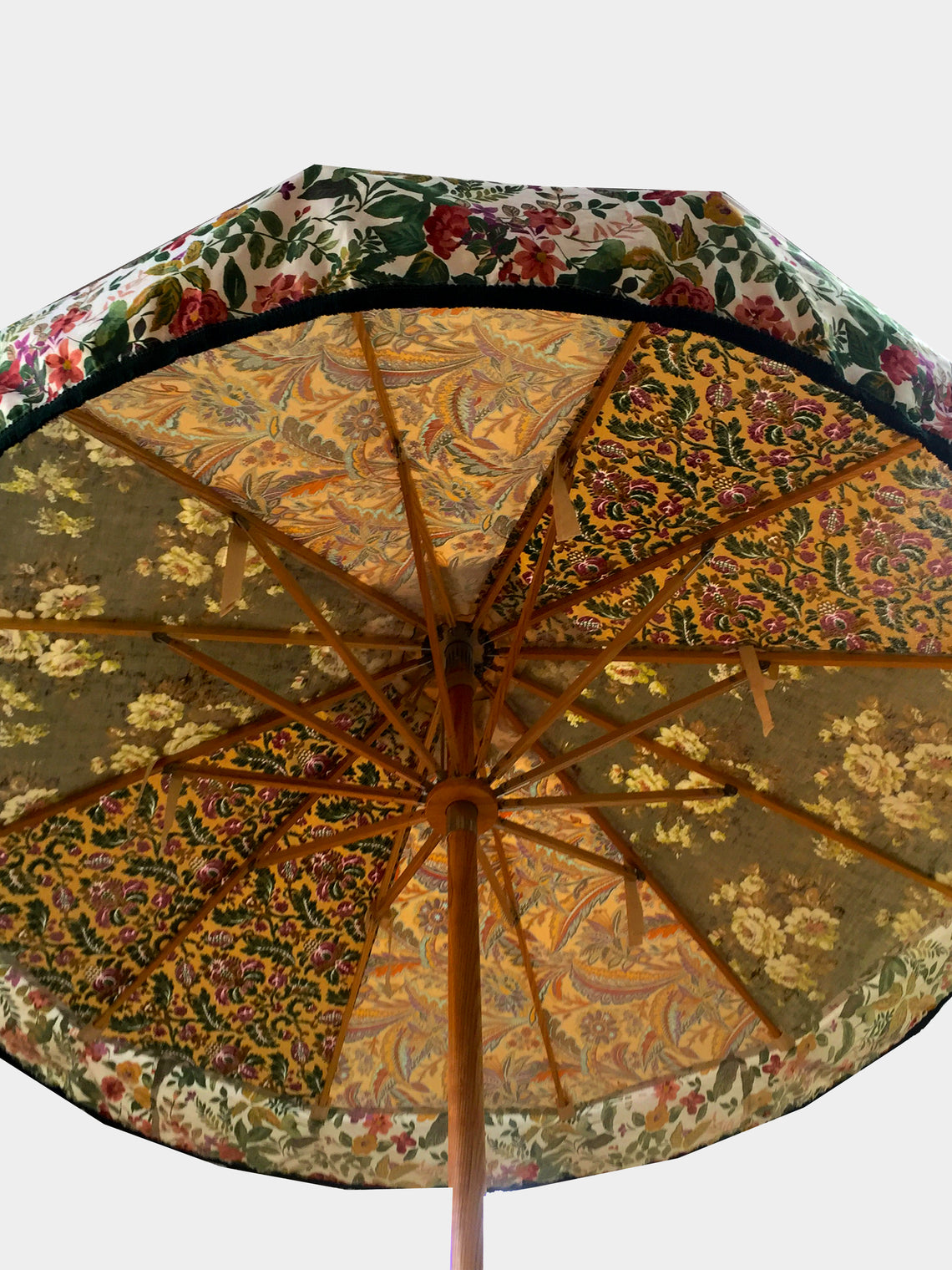 In 2011, Katy and Charlie Napier – artists and founders of Sunbeam Jackie – unveiled their first limited edition collection at Glastonbury, UK. Since, they’ve become the first port of call for exuberant outdoor parasols. Each creation is a one-of-a-kind piece of art, pulling together hand-oiled ash timber frames and vintage, antique and designer fabrics that have been sourced by Katy from all over the British Isles. They work alongside a local marine welder in Falmouth who welds and polishes their stainless steel before the assembly takes place at their studio, a 12th-century grain store located in Cornwall’s UNESCO world heritage site.