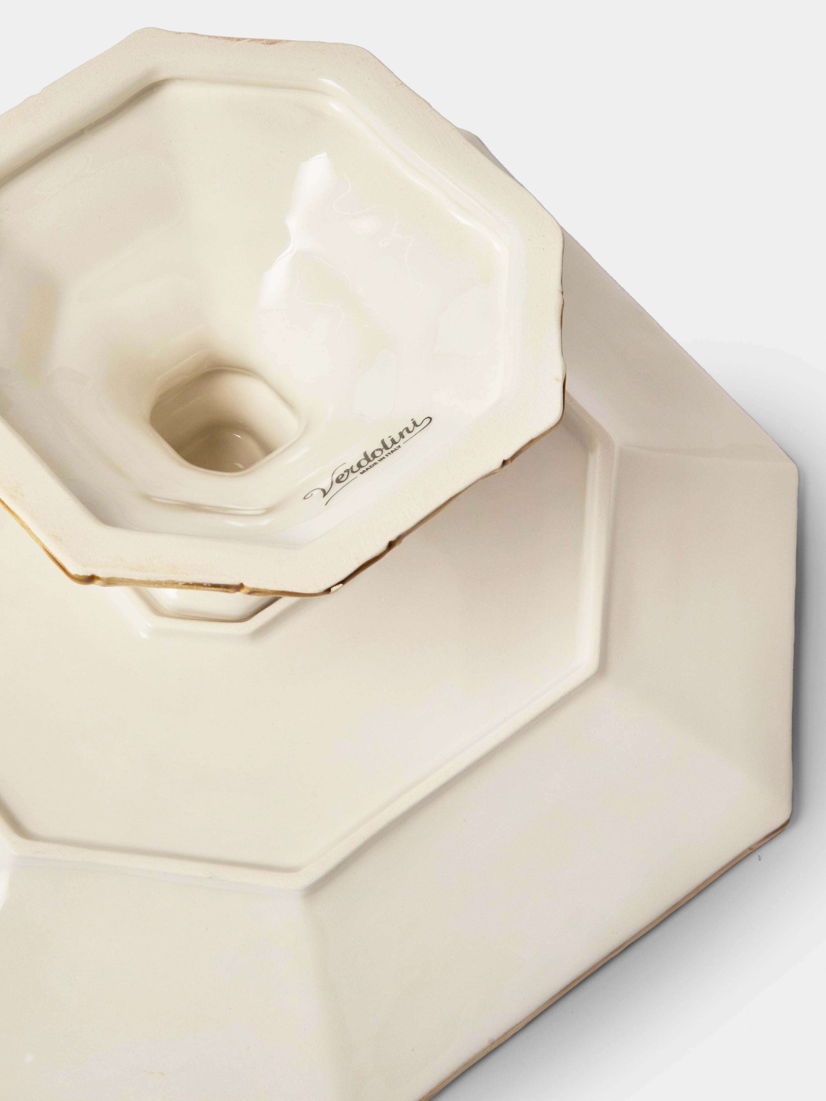 Born in northern Italy in 1964, Verdolini tells its story through ceramics, where earth, glaze and imagination meet. Each piece is shaped and finished by hand, its character revealed through centuries-old techniques and a quiet sense of wonder. Majolica brings to life scenes of foliage and frogs, while Traforato engraving lends lace-like intricacy to borders and edges. A Verdolini specialty lies in reviving archival designs, where historic patterns are reinterpreted with a playful eye and deep respect for the past.